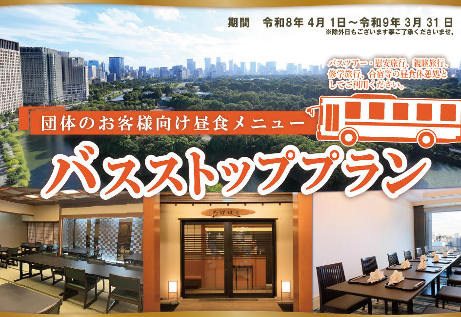 <たけはし>バスストッププラン 団体のお客様向け昼食メニュー 期間: 2026年04月01日(水) 〜 2027年03月31日(水) ランチ 日本料理 たけはし 期間・時間 2026年4月1日~2027年3月31日 料金 1名様 ¥3,500~